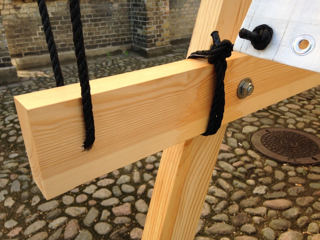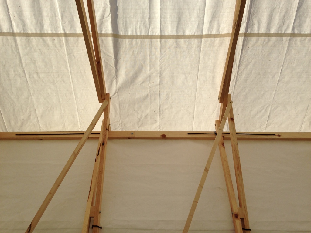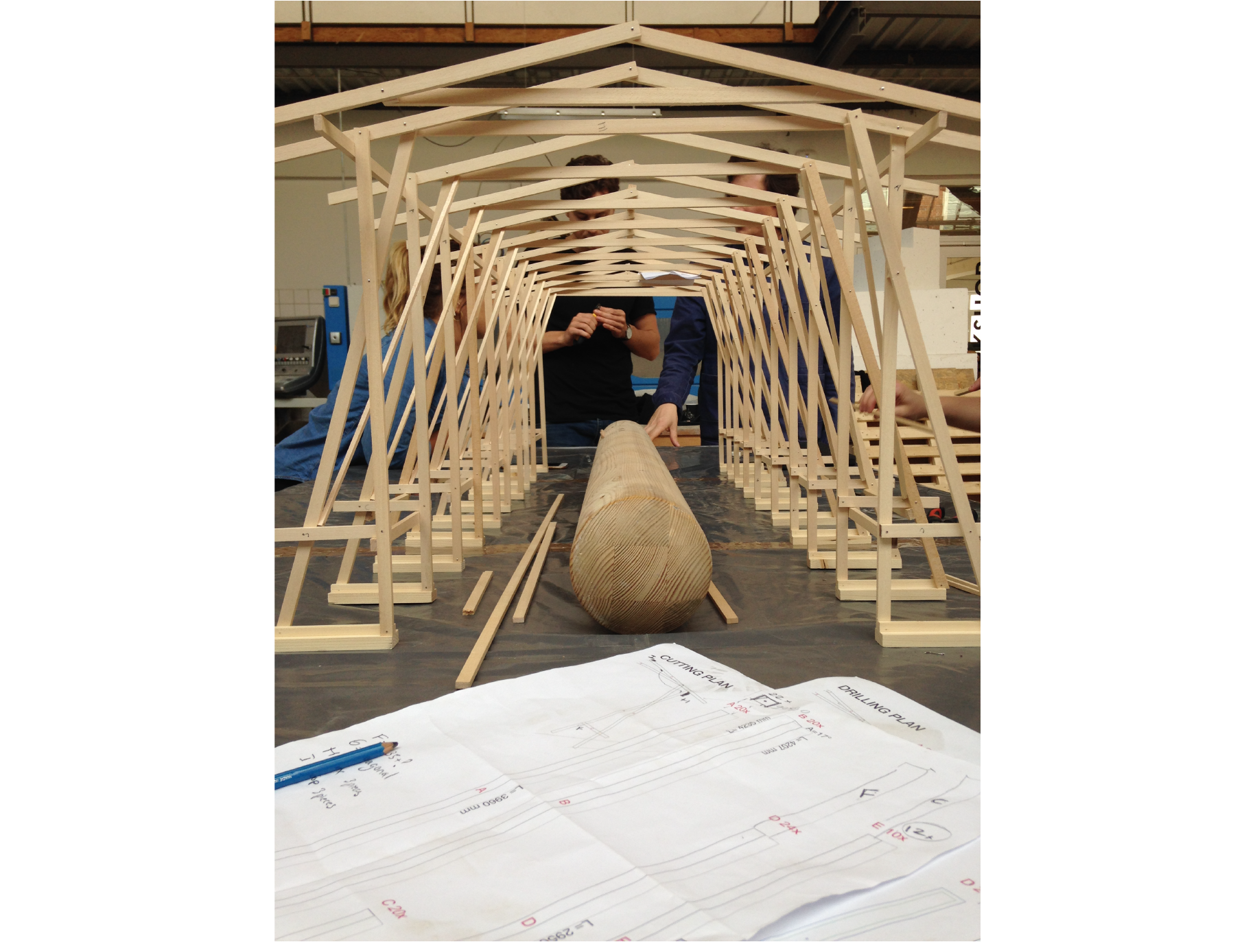 Personally, I was responsible for the wood construction, the other two teams worked on the concrete casted foundations and the fabric covering.The design was collectively made. I worked on a 1:10 construction model, defining the dimensions, a cutting and drilling plan, the cutting, plaining and drilling of the wood and the actual construction on site.